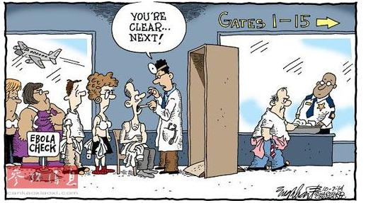 机场安检之前又多了一道“埃博拉检查”。医生说:“你没事……下一个!”(原载美国报刊漫画家协会网站)